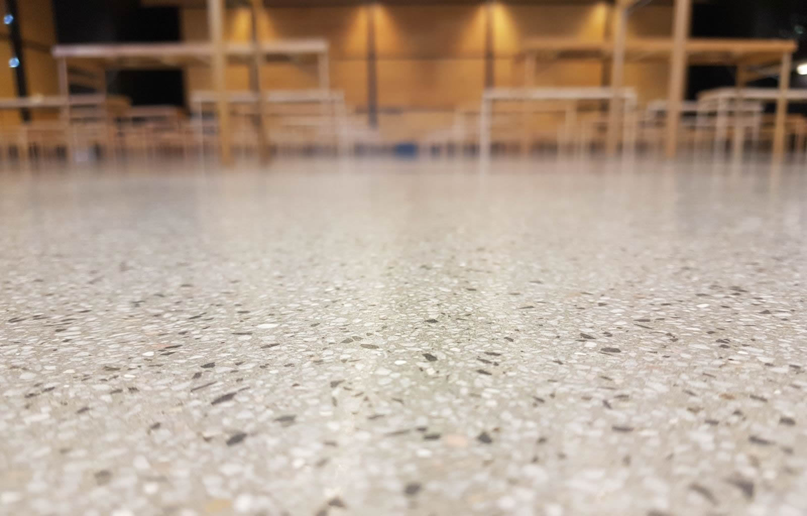 The floor is laid in one piece without any dilatation joints. Fine straight lines have discretely been cut into the Terrazzo Floor and then filled with the same material in a contrasting white colour. Because the floor is joint-free, making these subtle guidelines in the floor enables chairs or tables to be placed in straight lines.