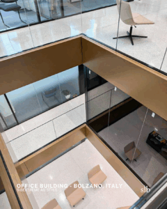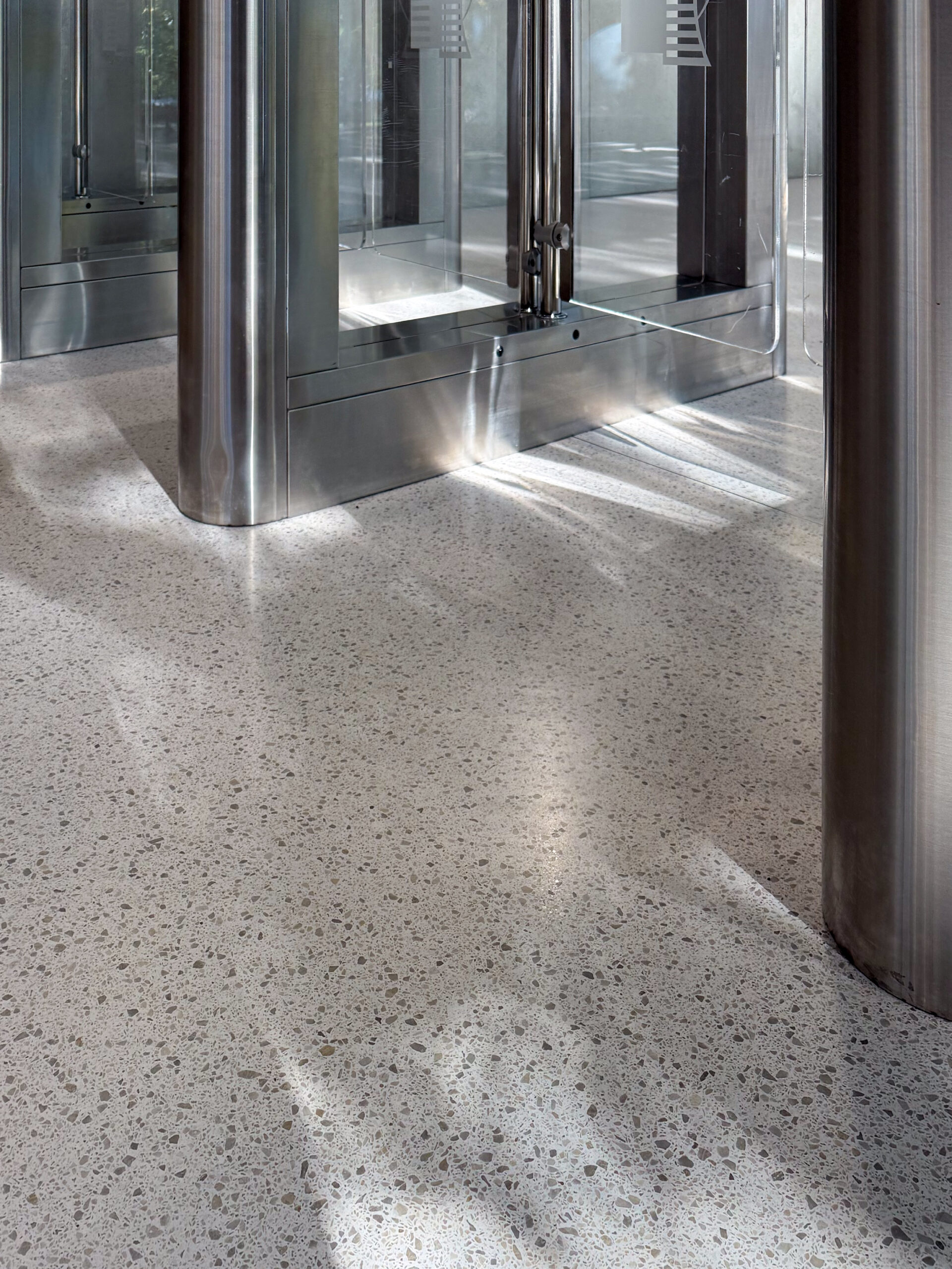 The lobby floor features a custom SIBEXTREME AG STYLE terrazzo finish. A mineral, two-component system engineered for seamless, joint-free floors, AG STYLE allows aggregate selection to be tailored to the design brief — here resulting in a refined, light-toned composition that complements the building’s sleek, contemporary interior.